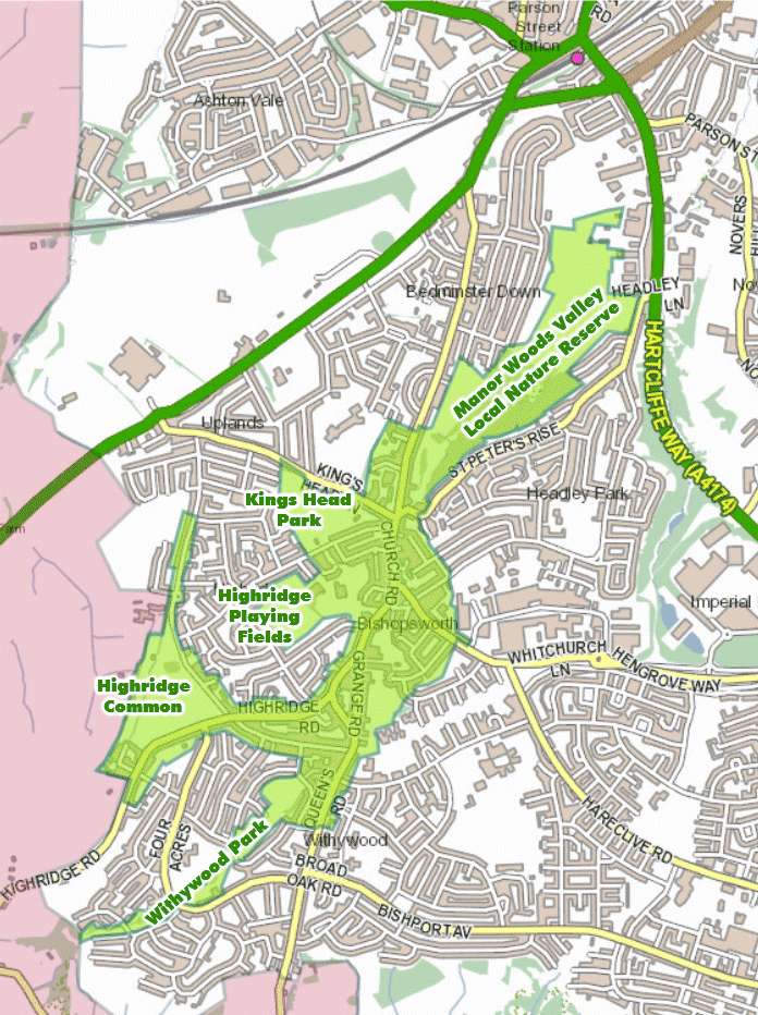 The Conservation Area is shown in light green and runs along the valley of the Malago stream from the City boundary in the south to the ‘Quarries’ area of Manor Woods Valley Local Nature Reserve in the north. It widens out in the middle to cover the heart of traditional Bishopsworth village, including its listed buildings at the Manor House, Chestnut Court and St Peter’s Church.